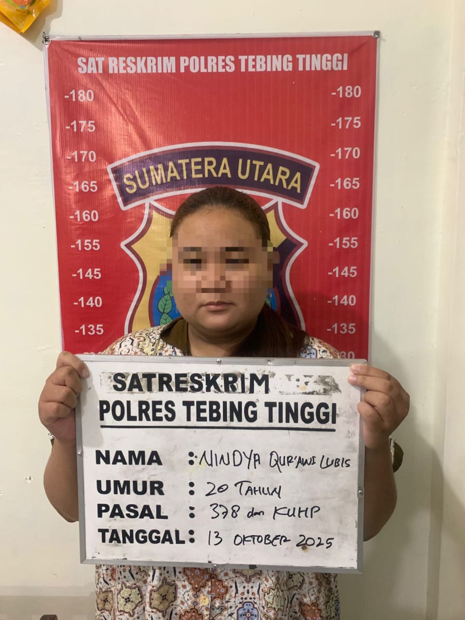 Sat Reskrim Polres Tebing Tinggi berhasil mengamankan seorang perempuan berinisial NQL alias Nindya (20), warga Jalan Kutilang Perum Purnawirawan, yang diduga melakukan tindak pidana penipuan berkedok investasi dengan kerugian mencapai Rp 45 juta.
