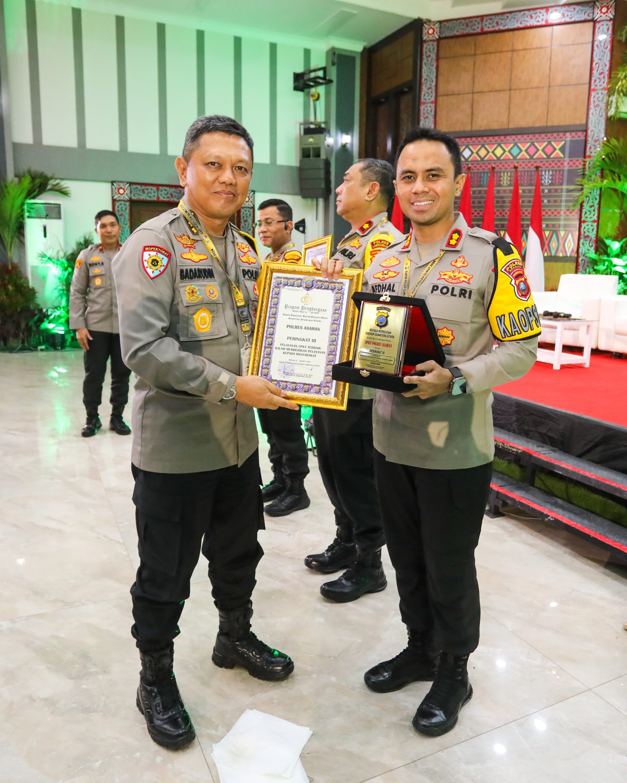 Asahan – Rabu (13/3/2024) – Kapolres Asahan AKBP AFDHAL JUNAIDI S. I. K., M. M, M. H Menerima penghargaan ke 3 Penilaian SPKT Terbaik Dari Kapolda Sumut dalam acara Rapimda Polda Sumut.