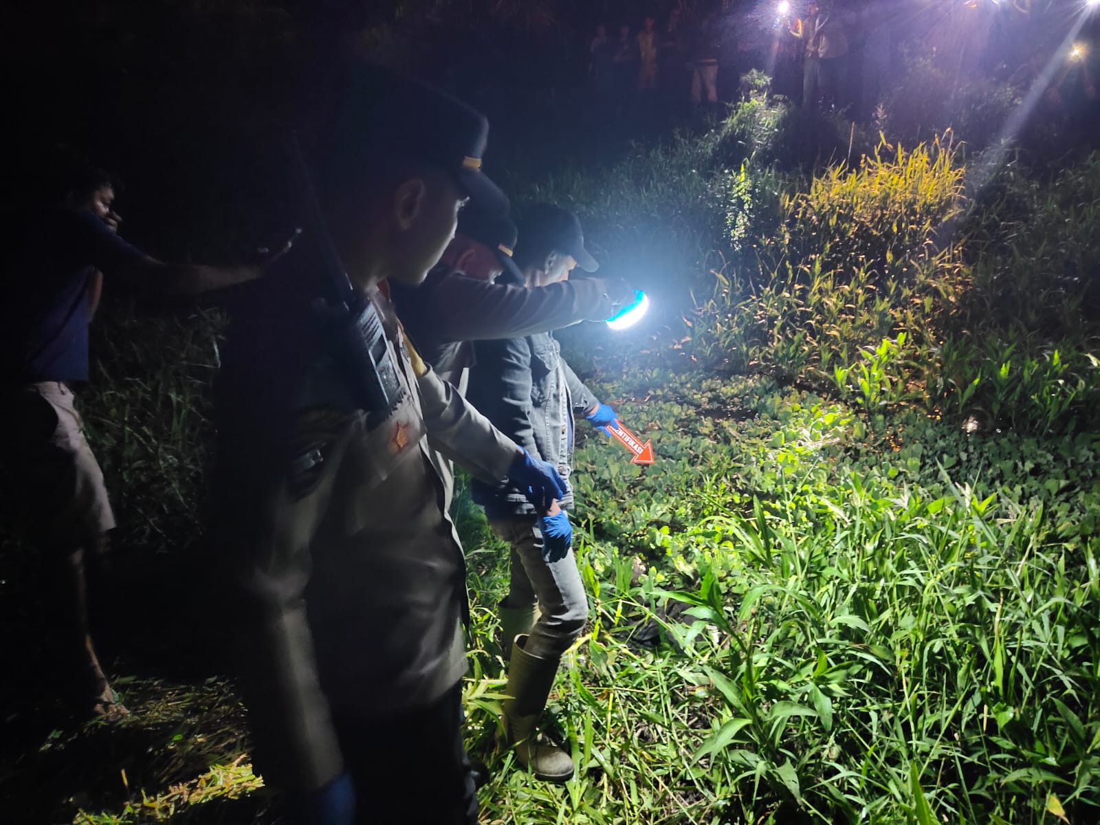 Personel Polres Tebing Tinggi bergerak menangani penemuan sesosok mayat laki-laki dewasa yang ditemukan mengambang di aliran Sungai Lagunda, tepatnya di Dusun Blok 17, Desa Bandar Tengah Kecamatan Bandar Khalipah, Kabupaten Serdang Bedagai, Minggu malam (1/3/2026).