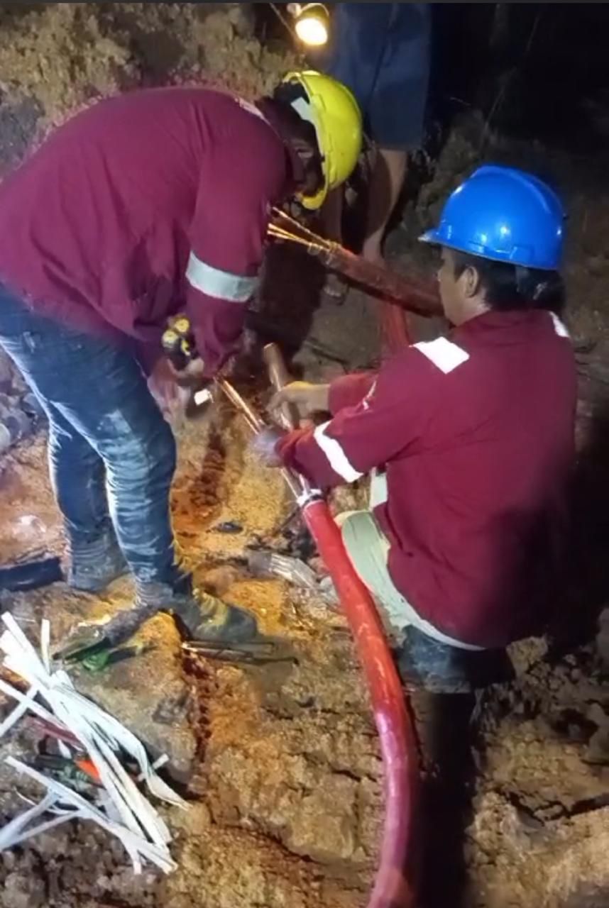 Kabel tersebut, rusak akibat tergeruk oleh alat berat yang bekerja. Selanjutnya, dilakukan perbaikan terhadap kabel yang putus dengan mengupas kabel, dan kemudian menyambungkan kembali serta menutup sambungan dengan menggunakan resin.