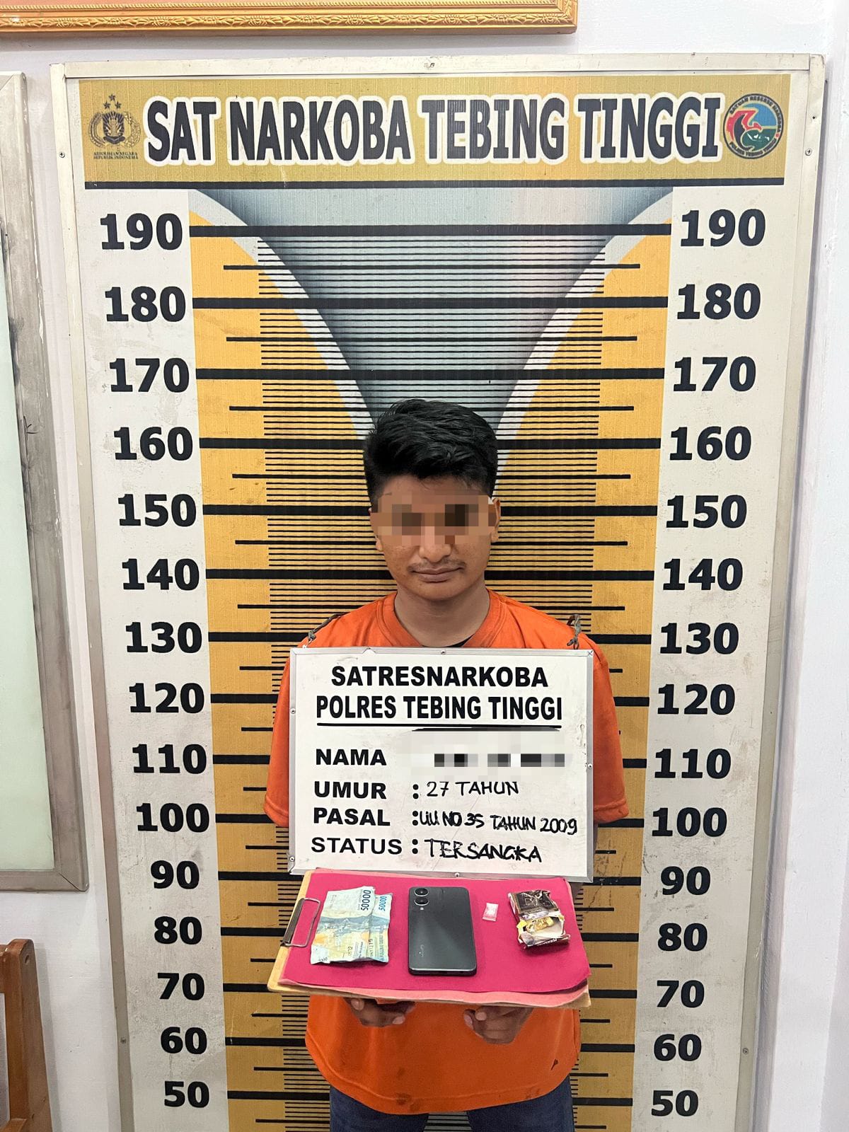 “Dalam penggerebekan tersebut, petugas berhasil mengamankan barang bukti berupa satu bungkus plastik klip transparan berisi serbuk kristal yang diduga narkotika jenis sabu dengan berat kotor 0,32 gram. Selain itu, turut disita satu buah kotak rokok, satu unit handphone dan uang tunai”, ungkap Kasi Humas Polres Tebing Tinggi AKP Mulyono, Selasa (6/5).