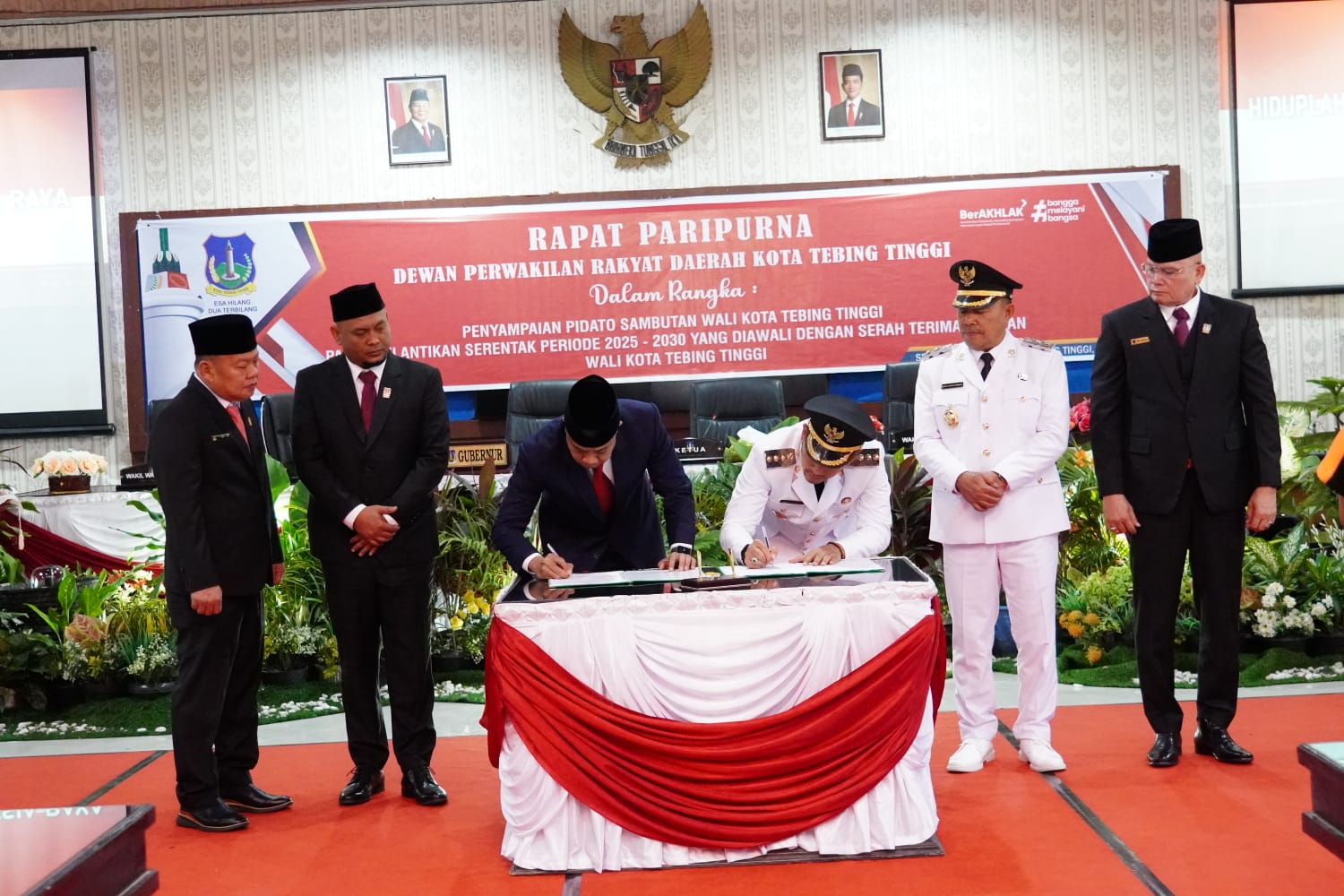 Tebing Tinggi, Transpublik.com,- Serah terima jabatan (sertijab) Wali Kota Tebing Tinggi dari Penjabat (Pj.) Wali Kota Tebing Tinggi Dr. Moettaqien Hasrimi, S.STP., M.Si kepada Wali Kota Tebing Tinggi H. Iman Irdian Saragih, S.E., berlangsung dalam rangkaian rapat paripurna DPRD (Dewan Perwakilan Rakyat Daerah) Kota Tebing Tinggi di ruang Sidang Utama DPRD, Jl. Dr. Sutomo, Kota Tebing Tinggi, Senin (03/03/2025).
